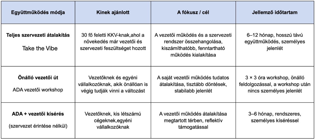Ime egy összefoglaló táblázat, amelyben szemléltetem, hogyan tudunk együtt dolgozni azért, hogy a céljaidnak leginkább megfelelő együttműködést válaszd!
