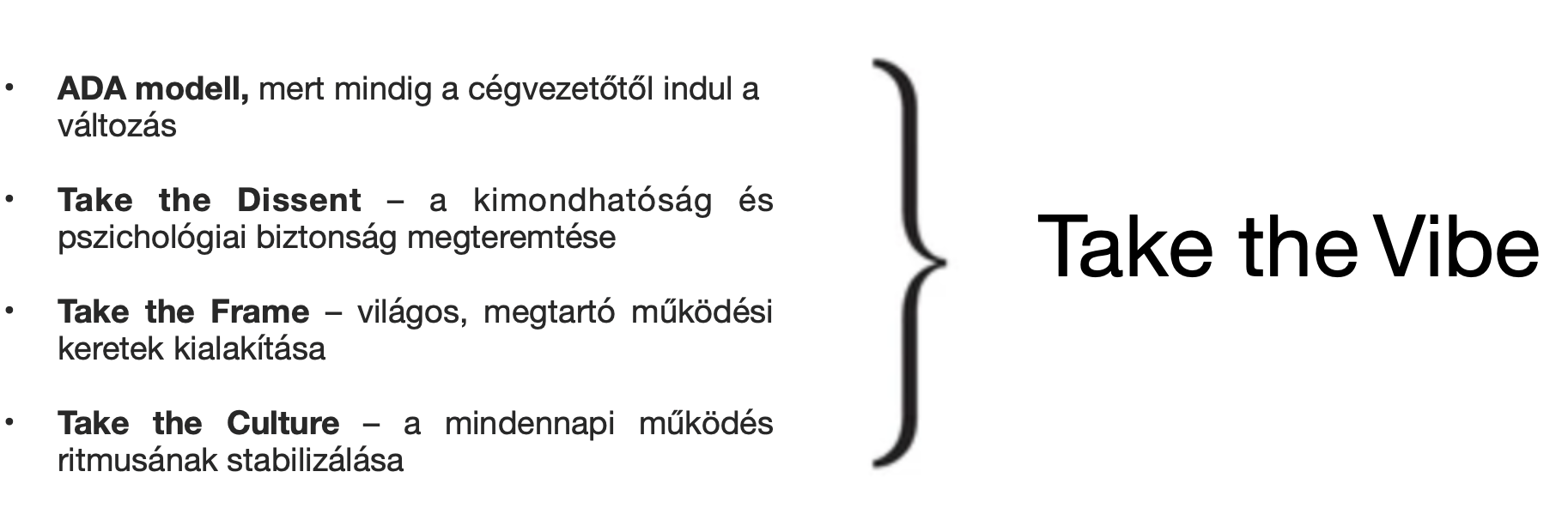 Ez a négy elem együtt alkotja a Take the Lead szervezeti átalakítási folyamatát, melynek neve: Take the Vibe.